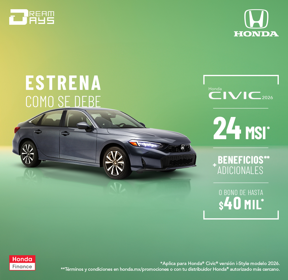 Vigencia del 1 al 30 de abril de 2026 o hasta agotar existencia lo que suceda primero. 24 meses sin intereses en la compra de una Honda® Civic® en versión i-STYLE modelo 2026, con 50% de enganche y plazo de 24 meses, con CAT del 31.9% sin IVA promedio informativo. No considera el costo del seguro de daños ni de vida, mismo que deberá ser cubierto financiado en la mensualidad. Crédito exclusivo con Honda Finance®. Aplican restricciones y está sujeto a aprobación de crédito. No incluye accesorios del vehículo. No aplica con otras promociones. Para más información acerca de requisitos y opciones de financiamiento visite su Distribuidor autorizado Honda® más cercano.