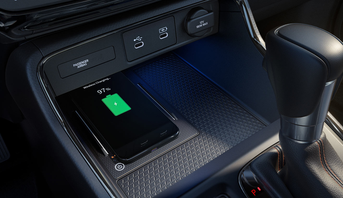 Su cargador inalámbrico y los puertos frontales USB tipo A y tipo C traseros* son prácticos y funcionales.