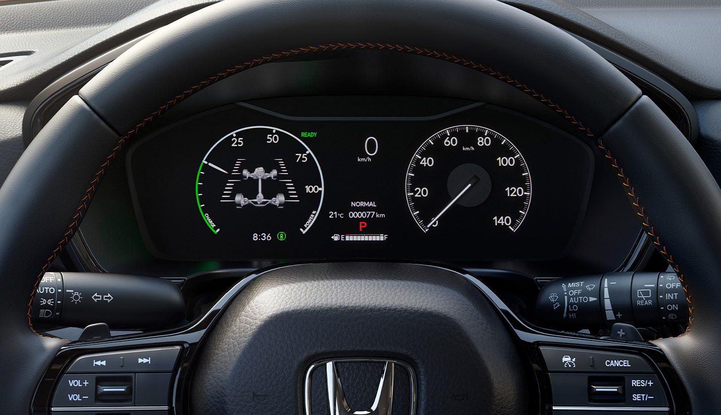 Honda CR-V Hybrid es una mejora constante en la maniobrabilidad, ya que está equipada con Sistema de tracción en las cuatro ruedas (AWD)***. Las paletas desaceleradoras de cambios en el volante (Deceleration Shifters) ofrecen un control preciso, mientras los modos de manejo Normal, ECON (con Sistema Eco Assist®) y Sport adaptan la experiencia a tus necesidades.