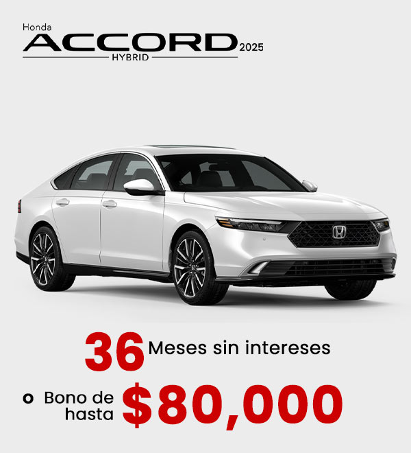 Vigencia del 01 al 31 de octubre de 2025 o hasta agotar existencias lo que suceda primero. 36 meses sin intereses en la compra de una Honda® Accord® en versión TOURING HEV modelo 2025, con 50% de enganche y plazo de 36 meses, con un CAT del 29.2% sin IVA promedio informativo. No considera el costo del seguro de daños ni de vida, mismo que deberá ser cubierto financiado en la mensualidad. Crédito exclusivo con Honda Finance®. Aplican restricciones y está sujeto a aprobación de crédito. No incluye accesorios del vehículo. No aplica con otras promociones. Para más información acerca de requisitos y opciones de financiamiento visite su Distribuidor autorizado Honda® más cercano.