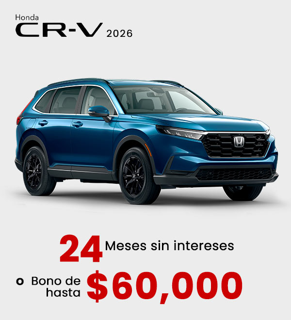 Vigencia del 01 al 31 de octubre de 2025 o hasta agotar existencias lo que suceda primero. 24 meses sin intereses en la compra de una Honda® CR-V® en versión TOURING, TOURING HEV y SPORT TOURING HEV modelo 2026, con 50% de enganche y plazo de 24 meses, con CAT del 29.7% sin IVA promedio informativo. No considera el costo del seguro de daños ni de vida, mismo que deberá ser cubierto financiado en la mensualidad. Crédito exclusivo con Honda Finance®. Aplican restricciones y está sujeto a aprobación de crédito. No incluye accesorios del vehículo. No aplica con otras promociones. Para más información acerca de requisitos y opciones de financiamiento visite su Distribuidor autorizado Honda® más cercano.