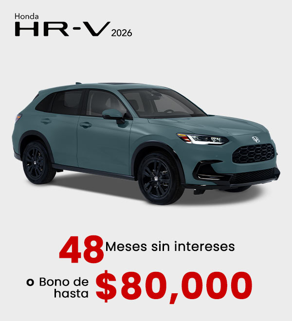 Vigencia del 01 al 31 de octubre de 2025 o hasta agotar existencias lo que suceda primero. 48 meses sin intereses en la compra de una Honda® HR-V® versión SPORT y TOURING modelo 2026, con 50% de enganche y plazo de 48 meses, con un CAT de 30.2% sin IVA promedio informativo. No considera el costo del seguro de daños ni de vida, mismo que deberá ser cubierto financiado en la mensualidad. Crédito exclusivo con Honda Finance®. Aplican restricciones y está sujeto a aprobación de crédito. No incluye accesorios del vehículo. No aplica con otras promociones. Para más información acerca de requisitos y opciones de financiamiento visite su Distribuidor autorizado Honda® más cercano.