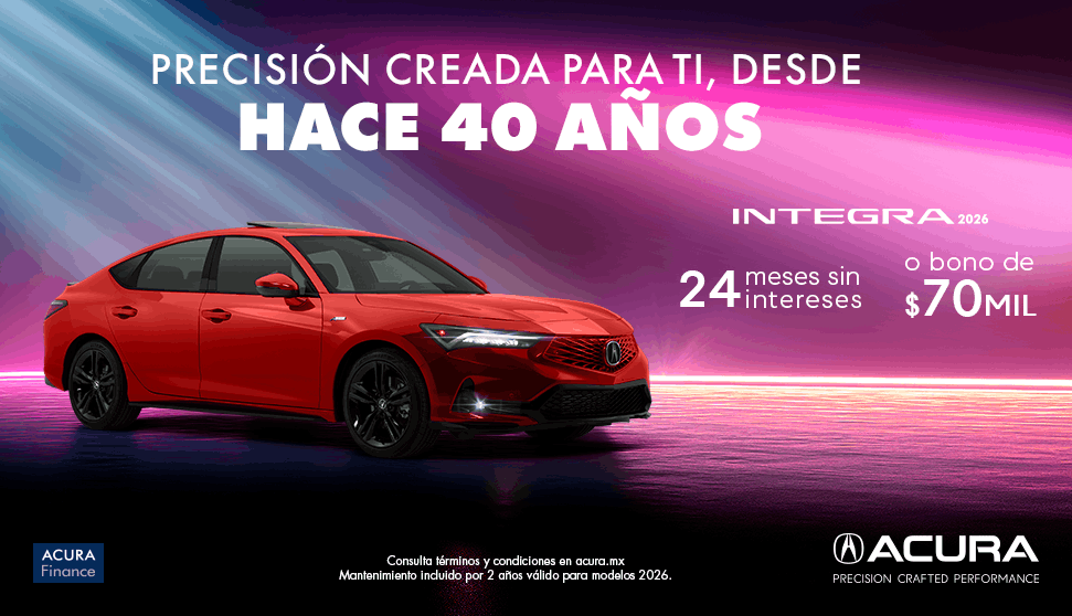 Vigencia del 1 al 30 de abril 2026 o hasta agotar existencia lo que suceda primero. Tasa desde 0.0% en la compra de un Acura® INTEGRA® en versión A-Spec modelo 2026, con 50% de enganche y plazo de hasta 24 meses, con un CAT de 29.0% sin IVA promedio informativo. No considera el costo del seguro de daños ni de vida, mismo que deberá ser cubierto financiado en la mensualidad. Crédito exclusivo con Acura Finance®. Aplican restricciones y está sujeto a aprobación de crédito. No incluye accesorios del vehículo. No aplica con otras promociones. Para más información acerca de requisitos y opciones de financiamiento visite su Distribuidor autorizado Acura® más cercano.