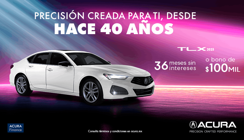 Vigencia del 1 al 30 de abril 2026 o hasta agotar existencia lo que suceda primero. Tasa desde 0.0% en la compra de un Acura® TLX® en versión Advance modelo 2025, con 50% de enganche y plazo de hasta 36 meses, con un CAT de 29.5% sin IVA promedio informativo. No considera el costo del seguro de daños ni de vida, mismo que deberá ser cubierto financiado en la mensualidad. Crédito exclusivo con Acura Finance®. Aplican restricciones y está sujeto a aprobación de crédito. No incluye accesorios del vehículo. No aplica con otras promociones. Para más información acerca de requisitos y opciones de financiamiento visite su Distribuidor autorizado Acura® más cercano.