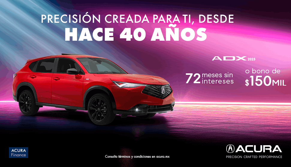Vigencia del 1 al 30 de abril 2026 o hasta agotar existencia lo que suceda primero. Tasa desde 0.0% en la compra de un Acura® ADX® en versión ADVANCE y A-Spec modelo 2025, desde 50% de enganche y plazo de hasta 72 meses, con un CAT de 30.5% sin IVA promedio informativo. No considera el costo del seguro de daños ni de vida, mismo que deberá ser cubierto financiado en la mensualidad. Crédito exclusivo con Acura Finance®. Aplican restricciones y está sujeto a aprobación de crédito. No incluye accesorios del vehículo. No aplica con otras promociones. Para más información acerca de requisitos y opciones de financiamiento visite su Distribuidor autorizado Acura® más cercano.