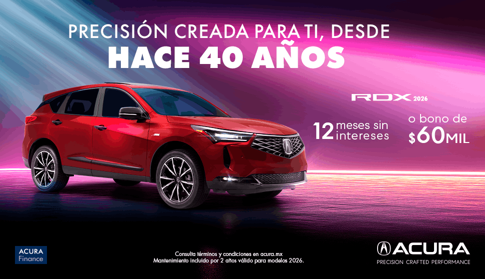Vigencia del 1 al 30 de abril 2026 o hasta agotar existencia lo que suceda primero. Tasa desde 0.0% en la compra de un Acura® RDX® en versión ADVANCE y A-Spec modelo 2026, desde 50% de enganche y plazo de hasta 12 meses con un CAT de 29.2% sin IVA promedio informativo. No considera el costo del seguro de daños ni de vida, mismo que deberá ser cubierto financiado en la mensualidad. Crédito exclusivo con Acura Finance®. Aplican restricciones y está sujeto a aprobación de crédito. No incluye accesorios del vehículo. No aplica con otras promociones. Para más información acerca de requisitos y opciones de financiamiento visite su Distribuidor autorizado Acura® más cercano.