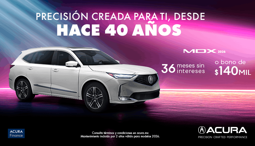 Vigencia del 1 al 30 de abril 2026 o hasta agotar existencia lo que suceda primero. Tasa desde 0.0% en la compra de un Acura® MDX® en versión ADVANCE modelo 2026, desde 50% de enganche y plazo de hasta 36 meses, con un CAT de 30.5% sin IVA promedio informativo. No considera el costo del seguro de daños ni de vida, mismo que deberá ser cubierto financiado en la mensualidad. Crédito exclusivo con Acura Finance®. Aplican restricciones y está sujeto a aprobación de crédito. No incluye accesorios del vehículo. No aplica con otras promociones. Para más información acerca de requisitos y opciones de financiamiento visite su Distribuidor autorizado Acura® más cercano.