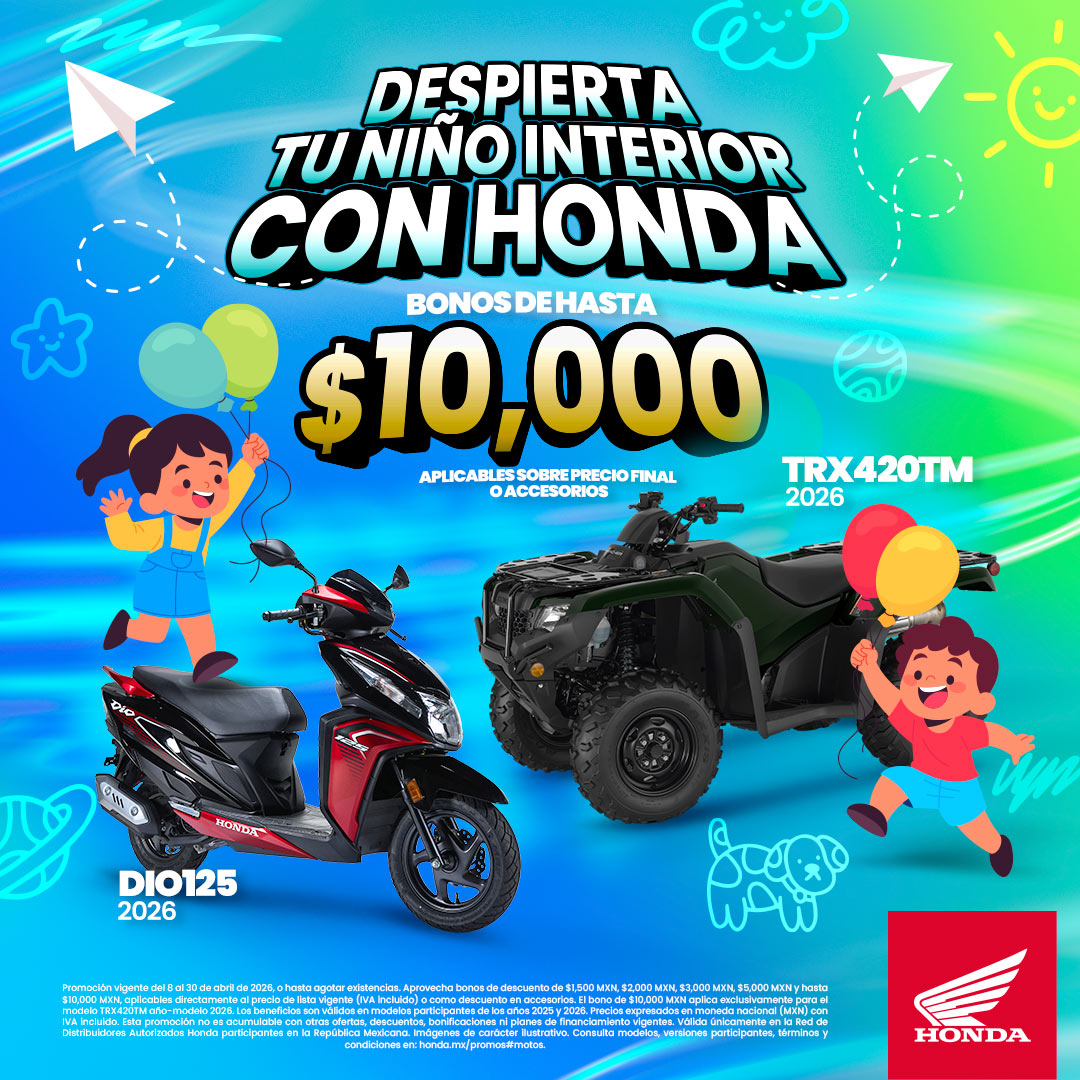 *Promoción vigente del 8 al 30 de abril de 2026, o hasta agotar existencias. Aprovecha bonos de descuento de $1,500 MXN, $2,000 MXN, $3,000 MXN, $5,000 MXN y hasta $10,000 MXN, aplicables directamente al precio de lista vigente (IVA incluido) o como descuento en accesorios. El bono de $10,000 MXN aplica exclusivamente para el modelo TRX420TM año-modelo 2026. Los beneficios son válidos en modelos participantes de los años 2025 y 2026. Precios expresados en moneda nacional (MXN) con IVA incluido. Esta promoción no es acumulable con otras ofertas, descuentos, bonificaciones ni planes de financiamiento vigentes. Válida únicamente en la Red de Distribuidores Autorizados Honda participantes en la República Mexicana. Imágenes de carácter ilustrativo. Consulta modelos, versiones participantes, términos y condiciones en: honda.mx/promos#motos.