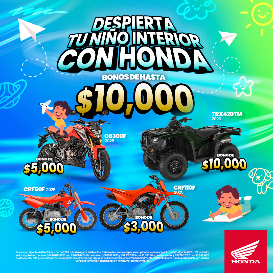 *Promoción vigente del 8 al 30 de abril de 2026, o hasta agotar existencias. Disfruta descuentos especiales aplicables sobre el precio de lista vigente (MXN, IVA incluido) en los siguientes modelos: TRX420TM 2026 con $10,000 MXN de descuento; CB300F 2025 y CRF50F 2025 con $5,000 MXN de descuento; y CRF110F 2025 con $3,000 MXN de descuento. Esta promoción no es acumulable con otras ofertas ni planes de financiamiento y es válida únicamente en Distribuidores Honda participantes en México. Consulta términos y condiciones en honda.mx/promos#motos.