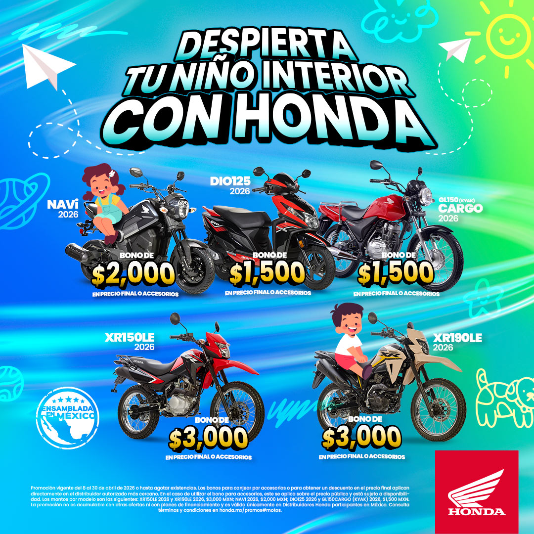 *Promoción vigente del 8 al 30 de abril de 2026 o hasta agotar existencias. Los bonos para canjear por accesorios o para obtener un descuento en el precio final aplican directamente en el distribuidor autorizado más cercano. En el caso de utilizar el bono para accesorios, este se aplica sobre el precio público y está sujeto a disponibilidad. Los montos por modelo son los siguientes: XR150LE 2026 y XR190LE 2026, $3,000 MXN; NAVI 2026, $2,000 MXN; DIO125 2026 y GL150CARGO (KYAK) 2026, $1,500 MXN. La promoción no es acumulable con otras ofertas ni con planes de financiamiento y es válida únicamente en Distribuidores Honda participantes en México. Consulta términos y condiciones en honda.mx/promos#motos.